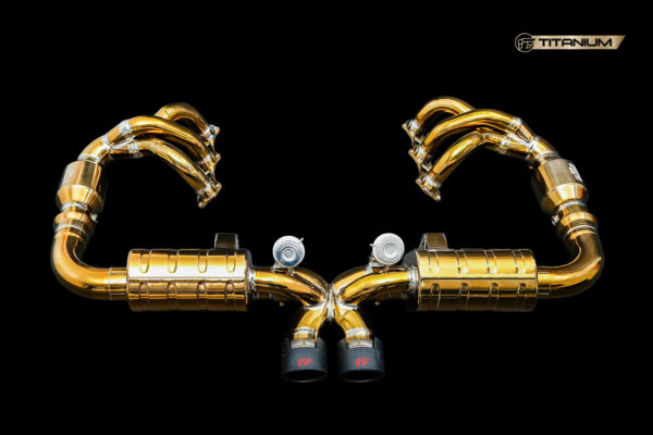 Porsche 991 GT3 Titanium Exhaust System The Porsche 991 GT3 Titanium Exhaust System is able to boast having the best of both worlds, remaining as light as possible, but still being able to give the Porsche 991 GT3 the roar it deserves! The Porsche 991 GT3 Titanium Exhaust System includes Headers with a cat pipe as well as a Valvetronic Muffler and a choice of custom Tips. The Porsche 991 GT3 Titanium Exhaust System boasts an extremely light weight compared with the stock exhaust system. Weighing53.1% less than the stock exhaust system, The Porsche 991 GT3 Titanium Exhaust System weighs only 12.17 Kg, after shedding 13.83Kg off the original! As well as its super lightweight the Porsche 991 GT3 Titanium Exhaust System allows for a noticeable improvement in the cars handling due to a much lighter rear of the vehicle, allowing for increased performance. The Porsche 991 GT3 Titanium Exhaust System valves are what make it possible to have that improvement in the cars torque and horsepower, whilst the systems muffler have been designed to give the Porsche 991 GT3 a sound worthy of its pedigree. The Porsche 991 GT3 Titanium Exhaust System opens up so many new possibilities, possibilities that any Porsche driver cannot be without.